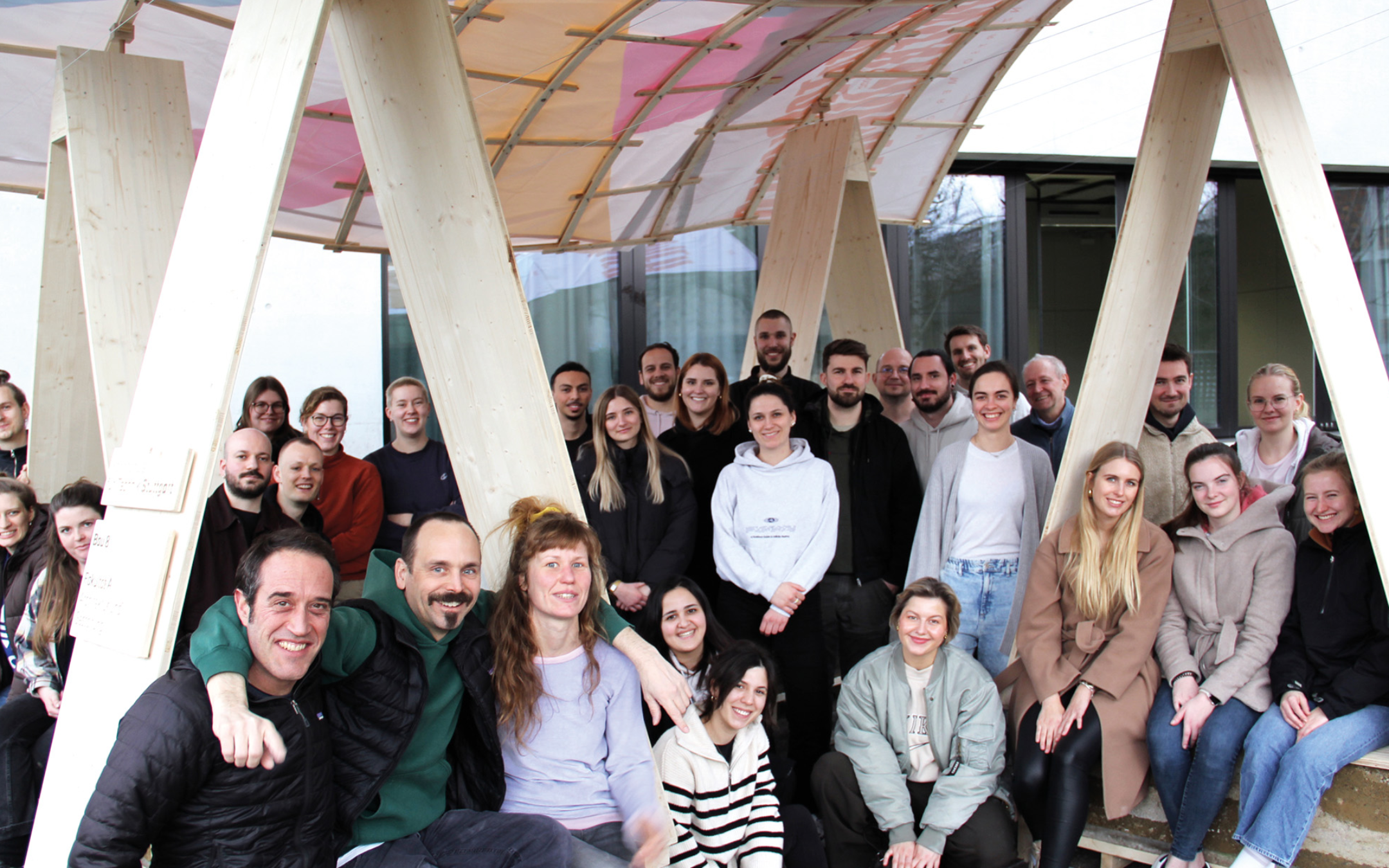 The Dächle is a covered bench system and creates a place for social interaction at the interface between the university and urban society. The Dächle is made of recyclable materials. On four supports, which also serve as benches, lies a lightweight roof structure that allows students, guests and passers-by to stay sheltered from the rain and sun. The Dächle is the built result of a design-build workshop that represents experiential-based learning through social processes and the use of bio-, geo- and re-use-based materials.